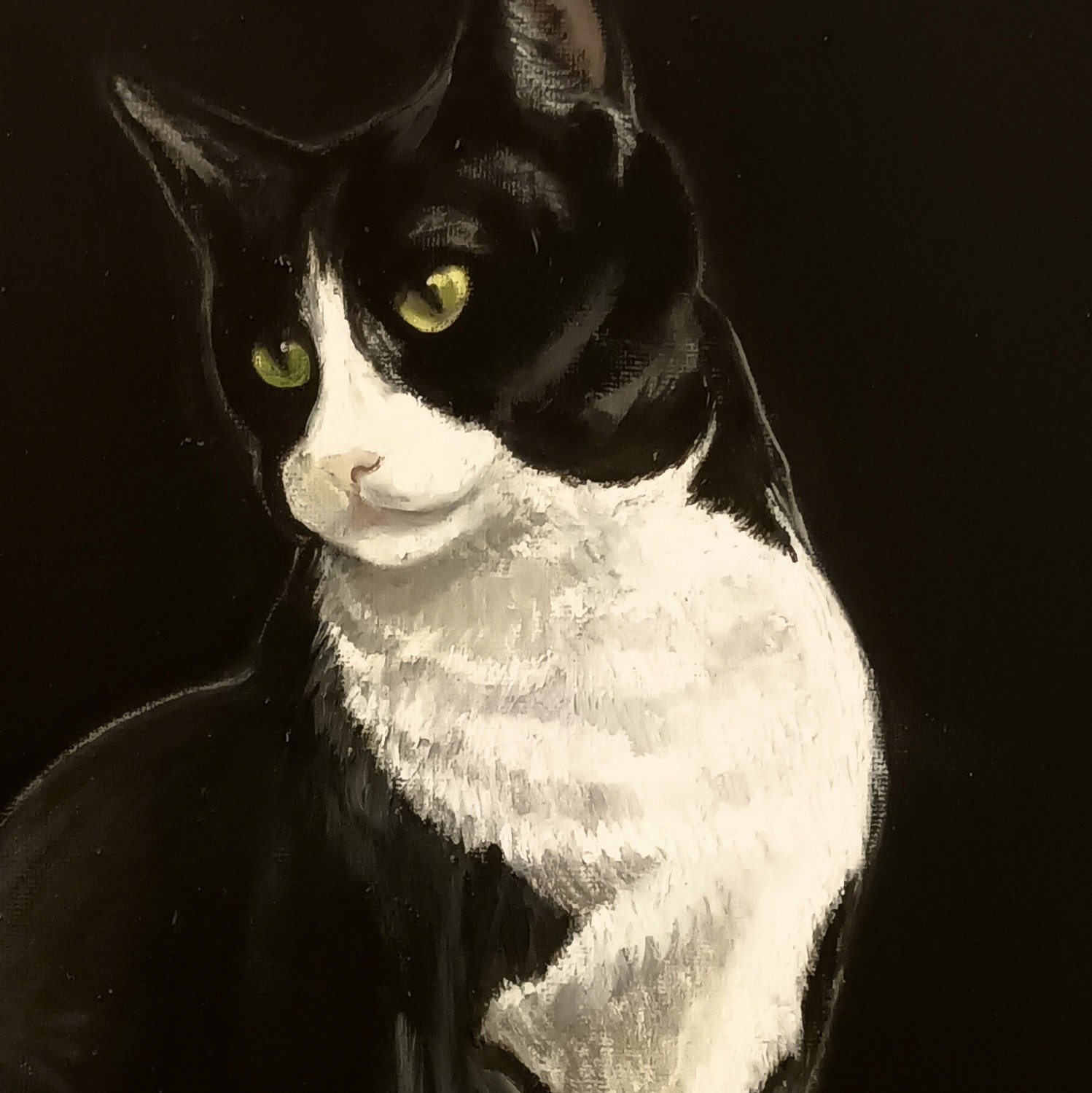 La figura si erge con portamento fiero, un contrasto vibrante tra la sua pelliccia ebano e il bianco candido del petto. Il suo sguardo intenso e sicuro scruta il mondo, un'espressione di nobiltà e fierezza felina. In questo dipinto, l'essenza del gatto viene esaltata, rivelando la sua forza interiore e la sua bellezza senza tempo