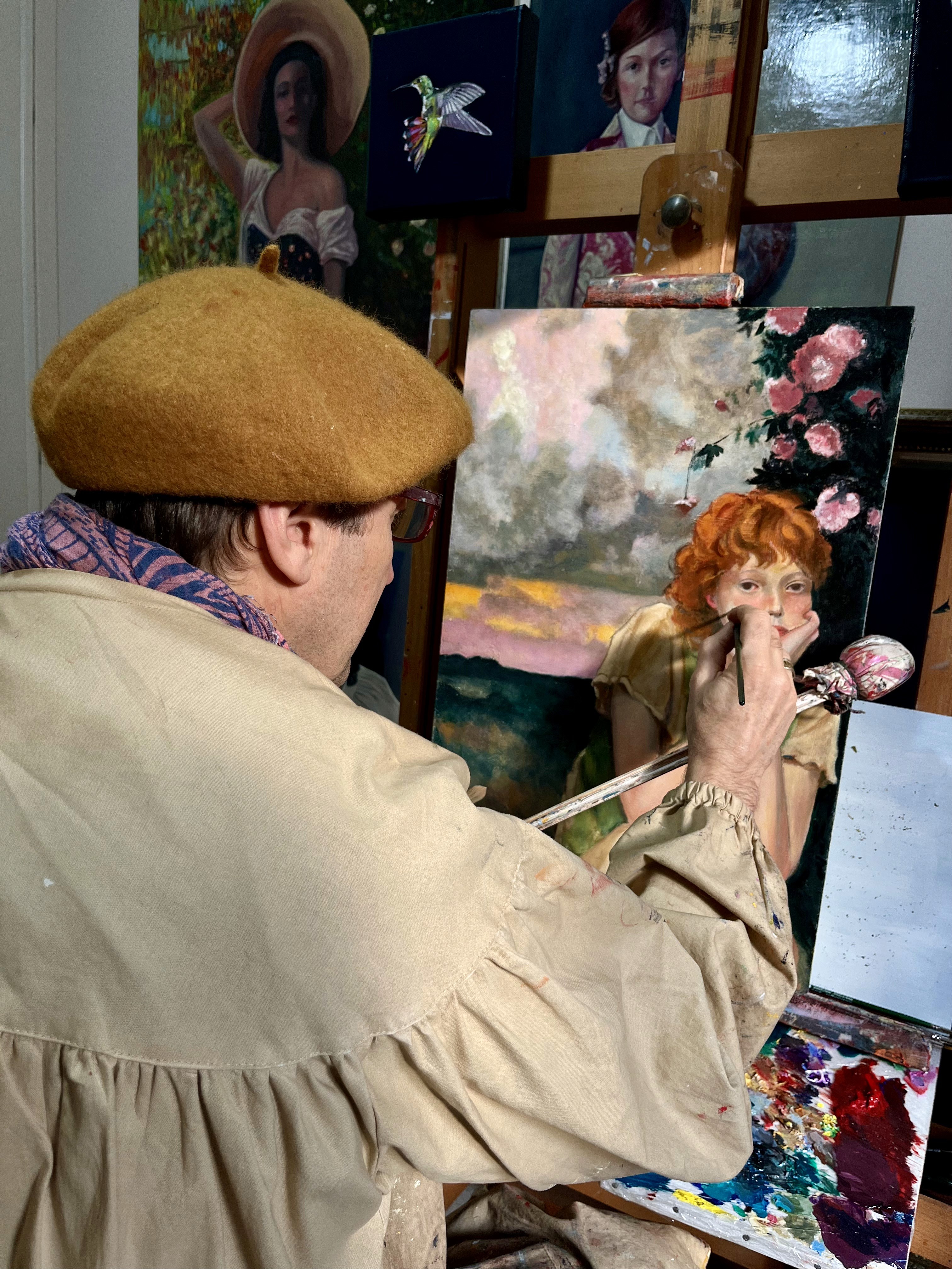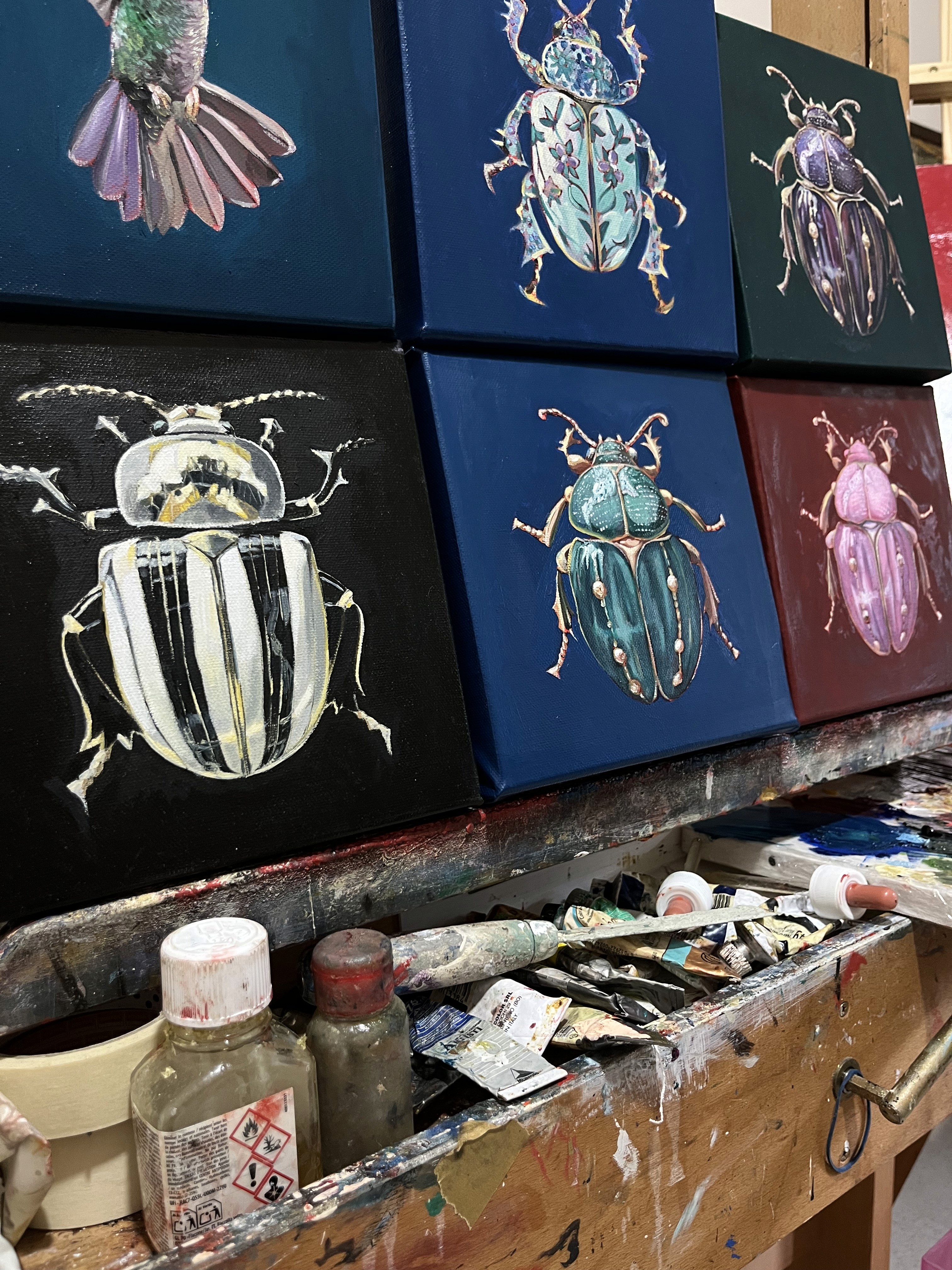 La sua è pittura figurativa nella tradizione più classica: olio su tela o tavola, disegno preparatorio, costruzione paziente per velature. I soggetti spaziano dalle composizioni più importanti agli scarabei gioiello e ai colibrì che popolano le Piccole Meraviglie, dalla serie iconica dei gatti ai cavalli che celebrano potenza e grazia. È nell'uso audace del colore che la contemporaneità esplode, portando nelle case di oggi opere che onorano la tecnica antica con uno sguardo vibrante e attuale.