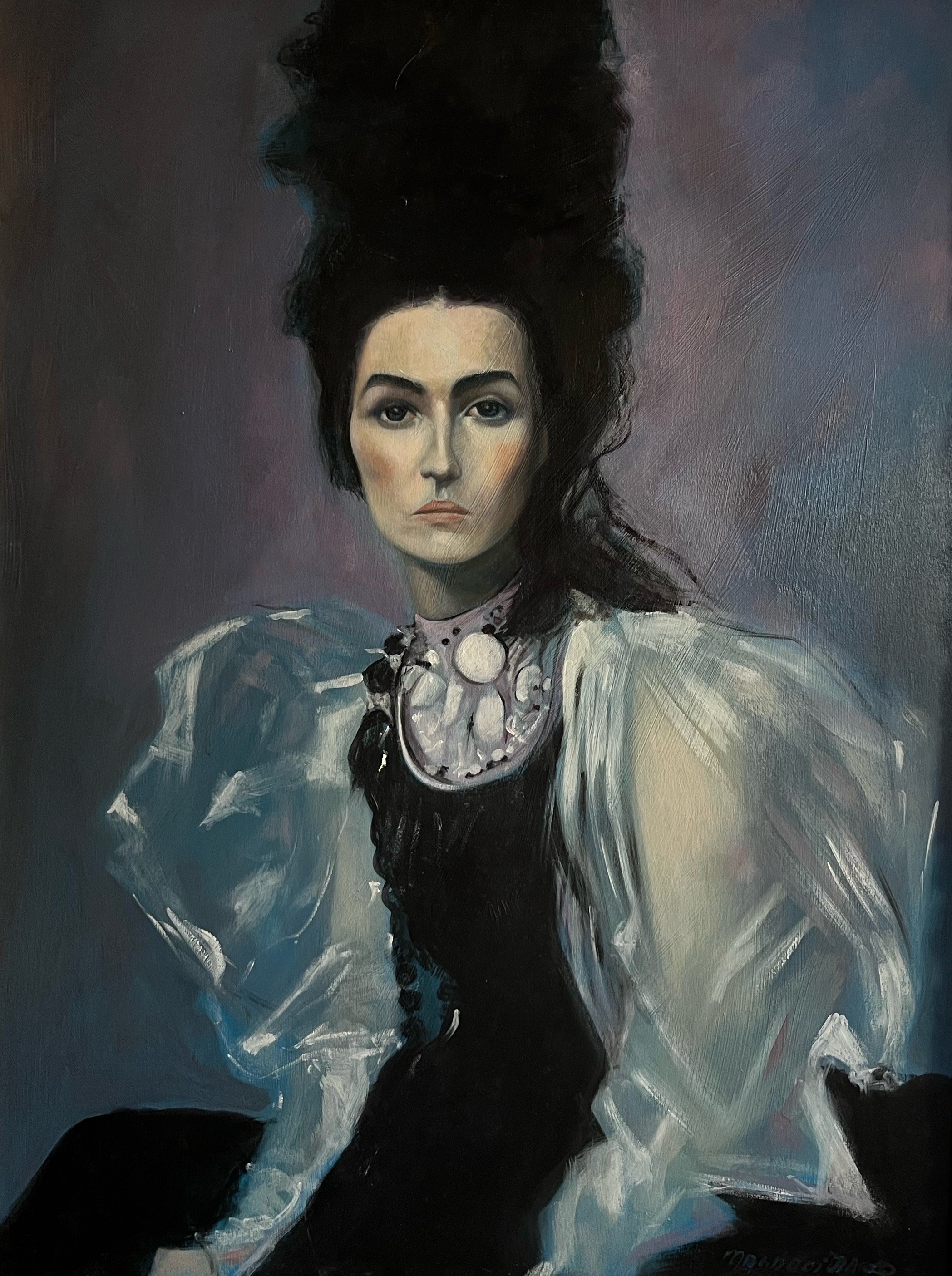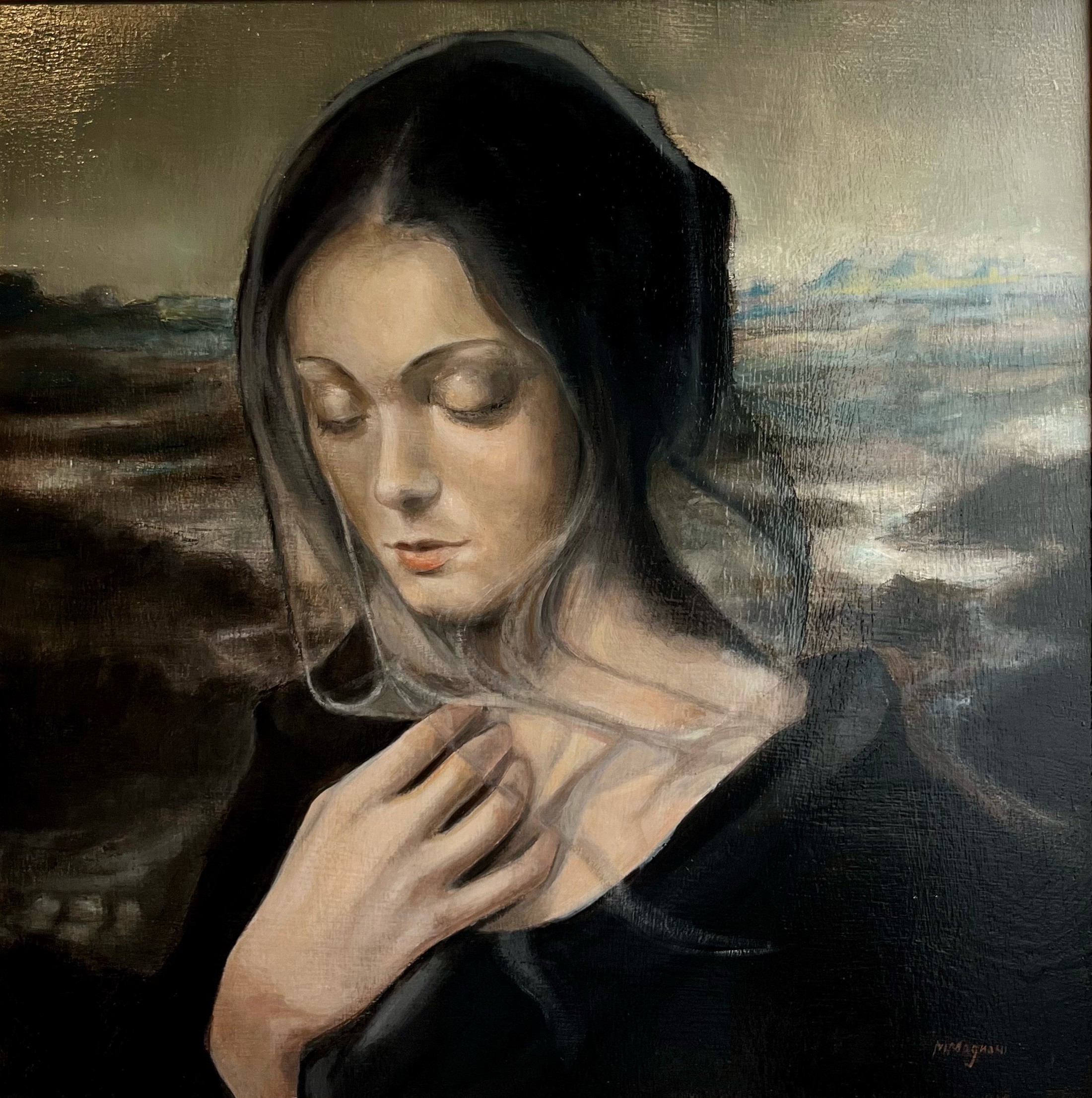 Con Velata I, Marco Magnani indaga il mistero della figura umana attraverso un gioco di ombre e velature che invita al raccoglimento interiore. L'opera fonde la tradizione dell'olio su tavola con una sensibilità moderna, dove la ricerca materica e il contrasto cromatico esaltano un volto che emerge con forza da uno sfondo profondo e indefinito.