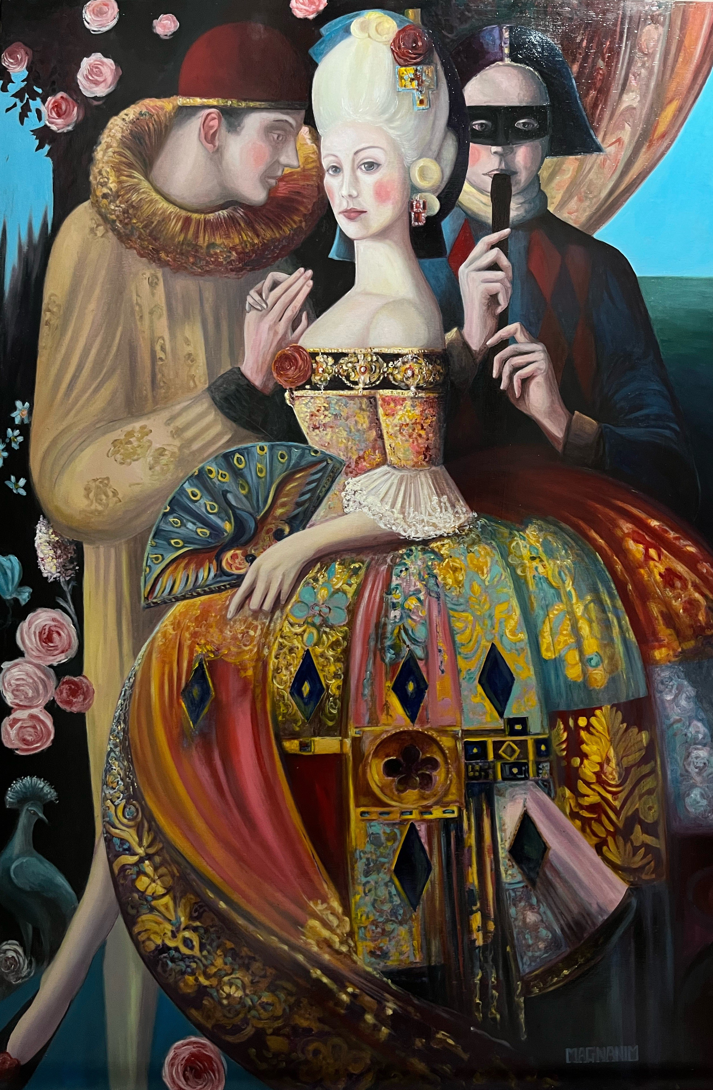 Una collezione di opere di varie dimensioni dedicata alla figura femminile. Qui la pittura di Marco si fa più introspettiva: ritratti e posture che mescolano la realtà del volto con decorazioni preziose, creando figure sospese tra mito e modernità.