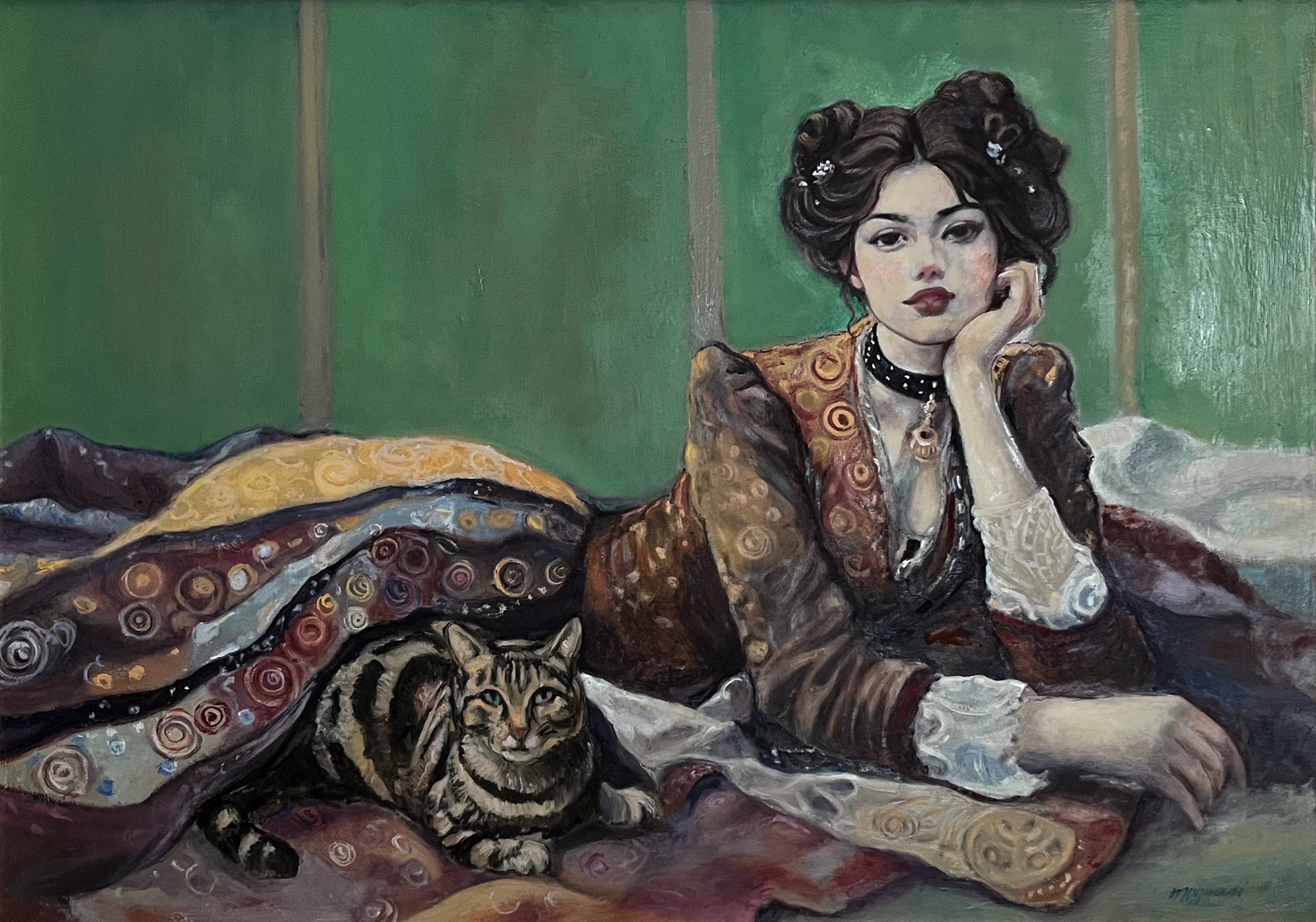 Qui la pittura di Marco si fa più introspettiva: ritratti e posture che mescolano la realtà del volto con decorazioni preziose, creando figure sospese tra mito e modernità.