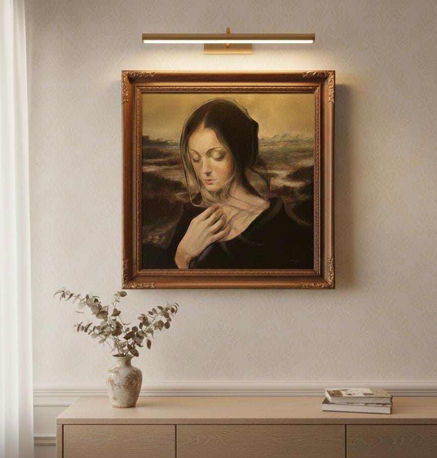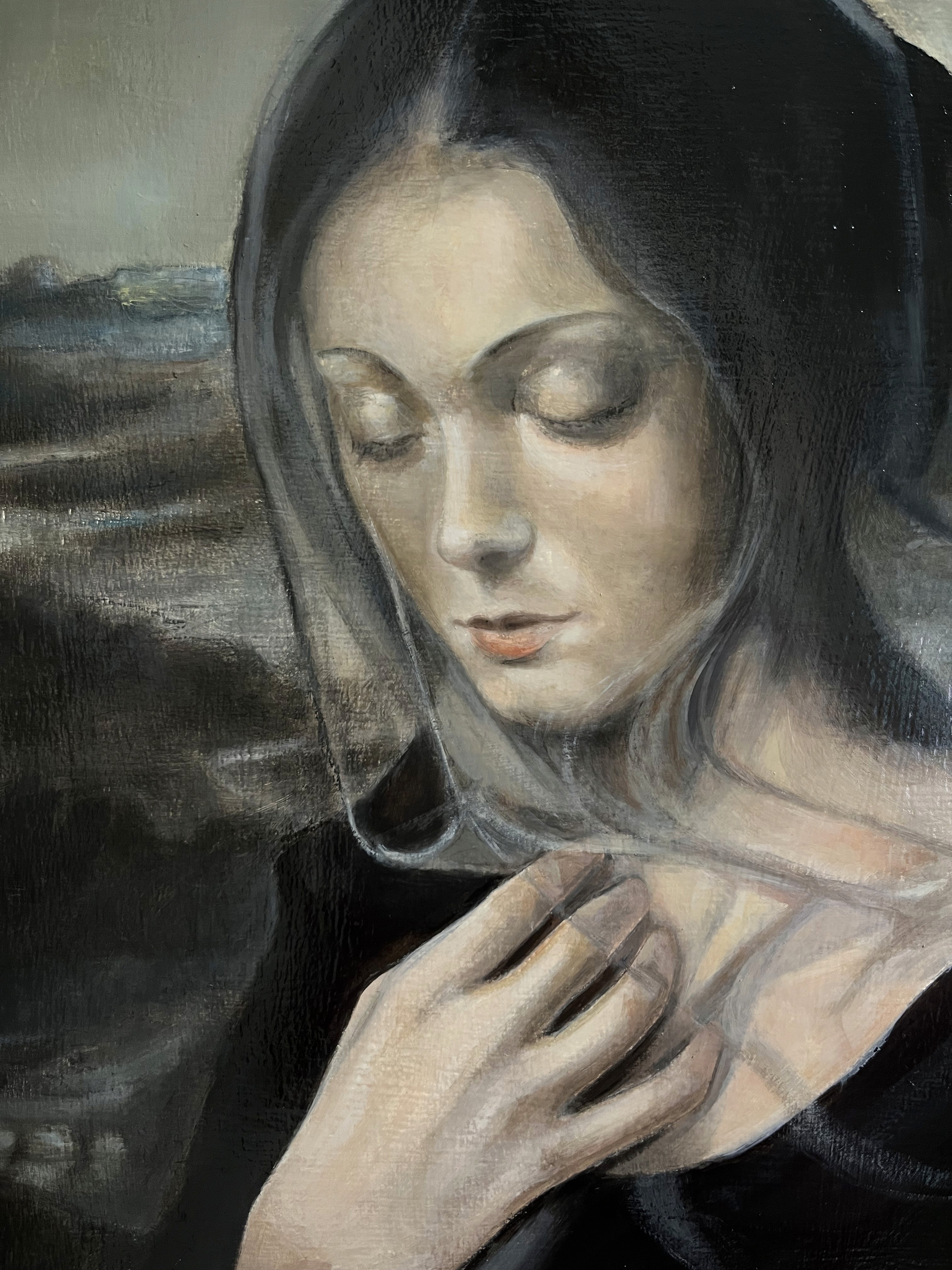 In Velata II, la ricerca poetica sul tema del silenzio e del sacro si esprime attraverso una figura immersa in un momento di assoluto raccoglimento. La grazia composta e lo sguardo abbassato suggeriscono un dialogo interiore profondo, trasformando il soggetto in un archetipo universale di protezione e pace interiore.