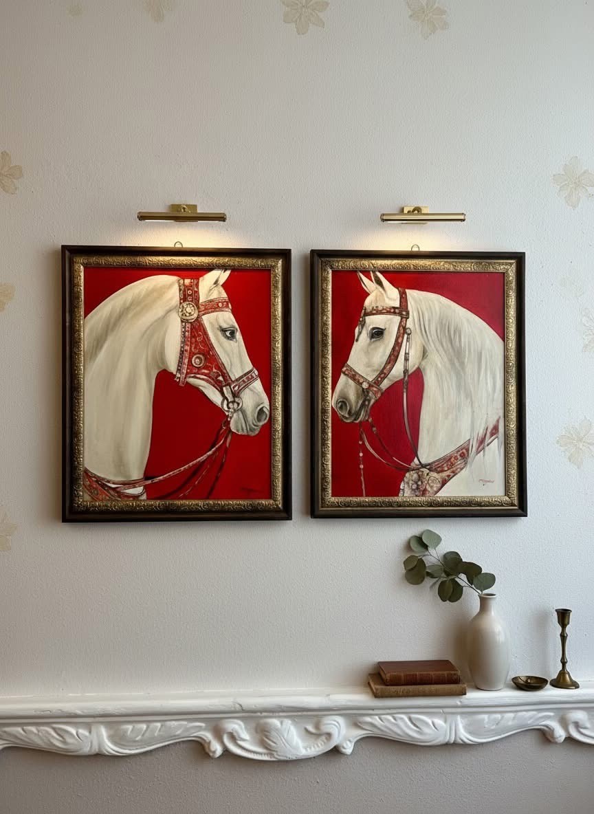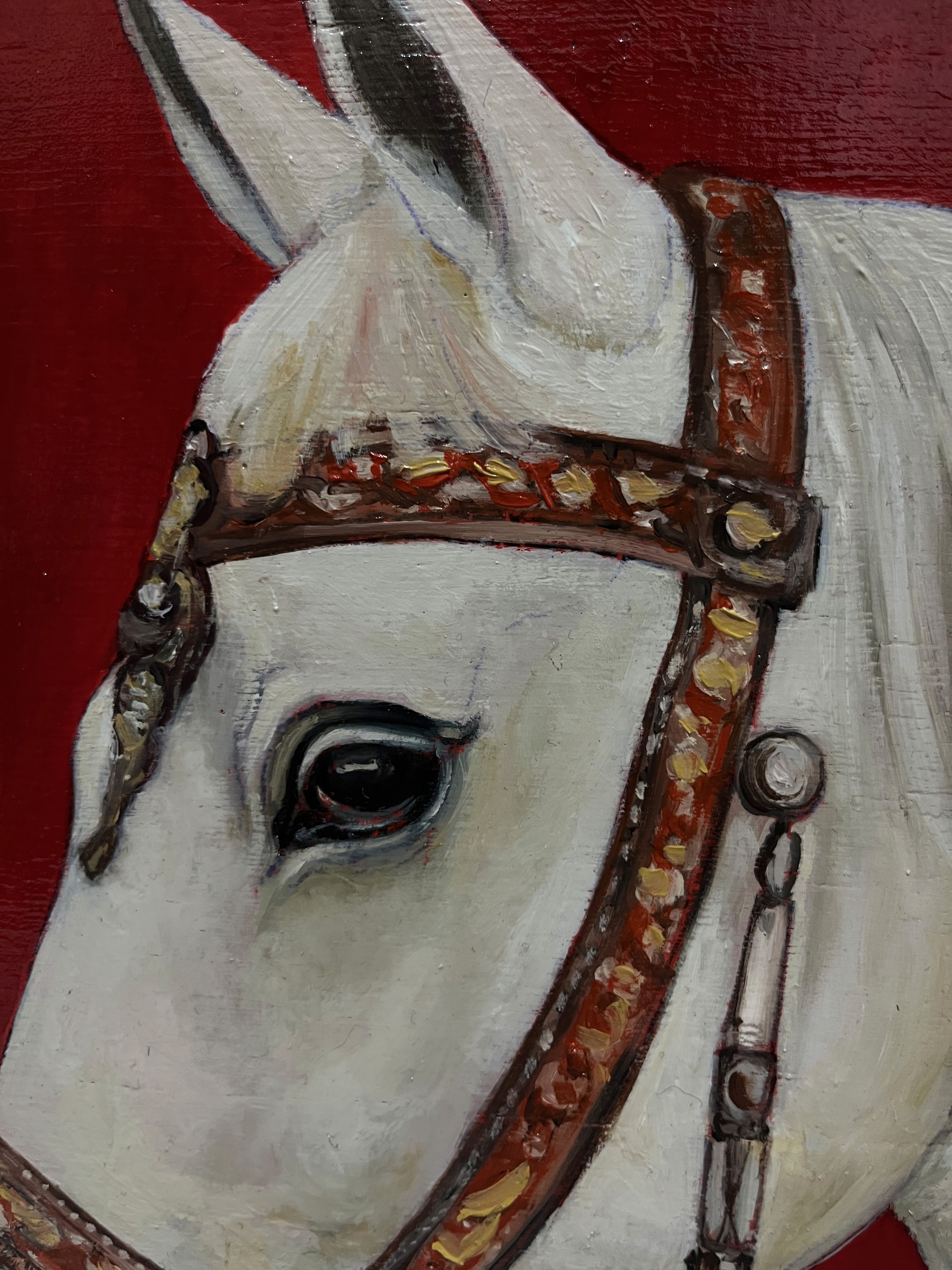 Questa tavola prosegue il dialogo visivo della precedente, giocando con simmetrie, colori e tensione cromatica. Il cavallo, nuovamente protagonista, emerge con carattere sul fondo rosso acceso, simbolo di energia e nobiltà.