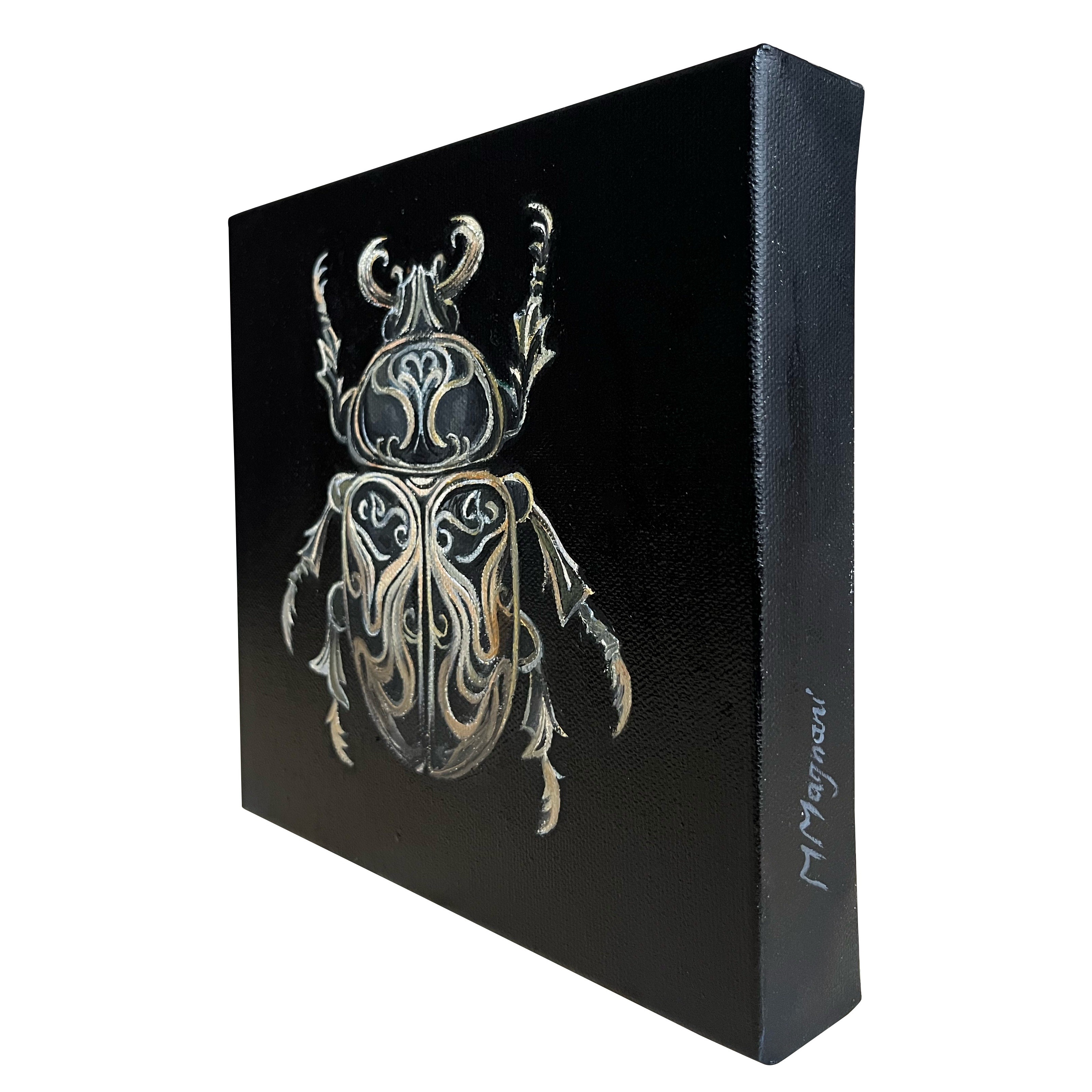 Scarabeo decorato con motivi dorati che creano un effetto visivo simile a un gioiello incastonato.