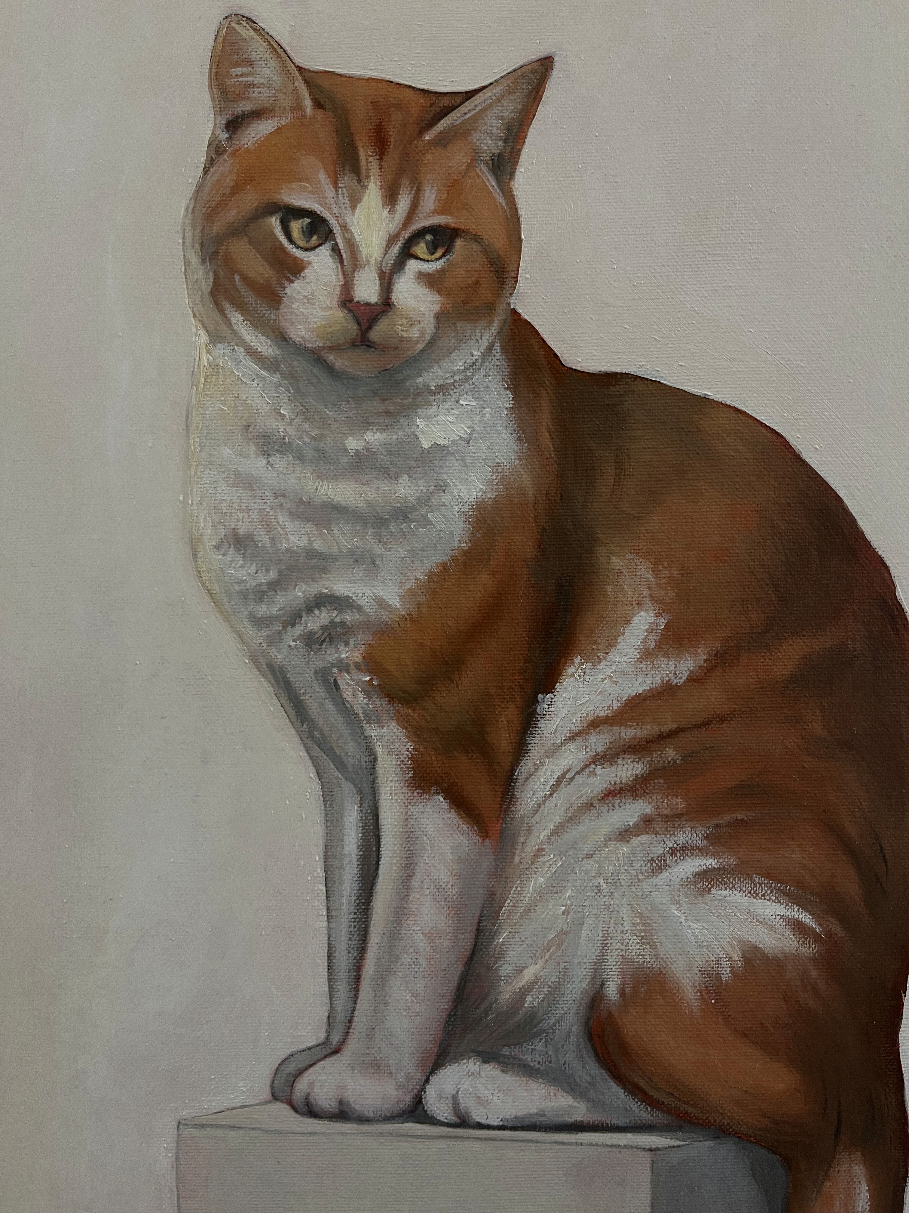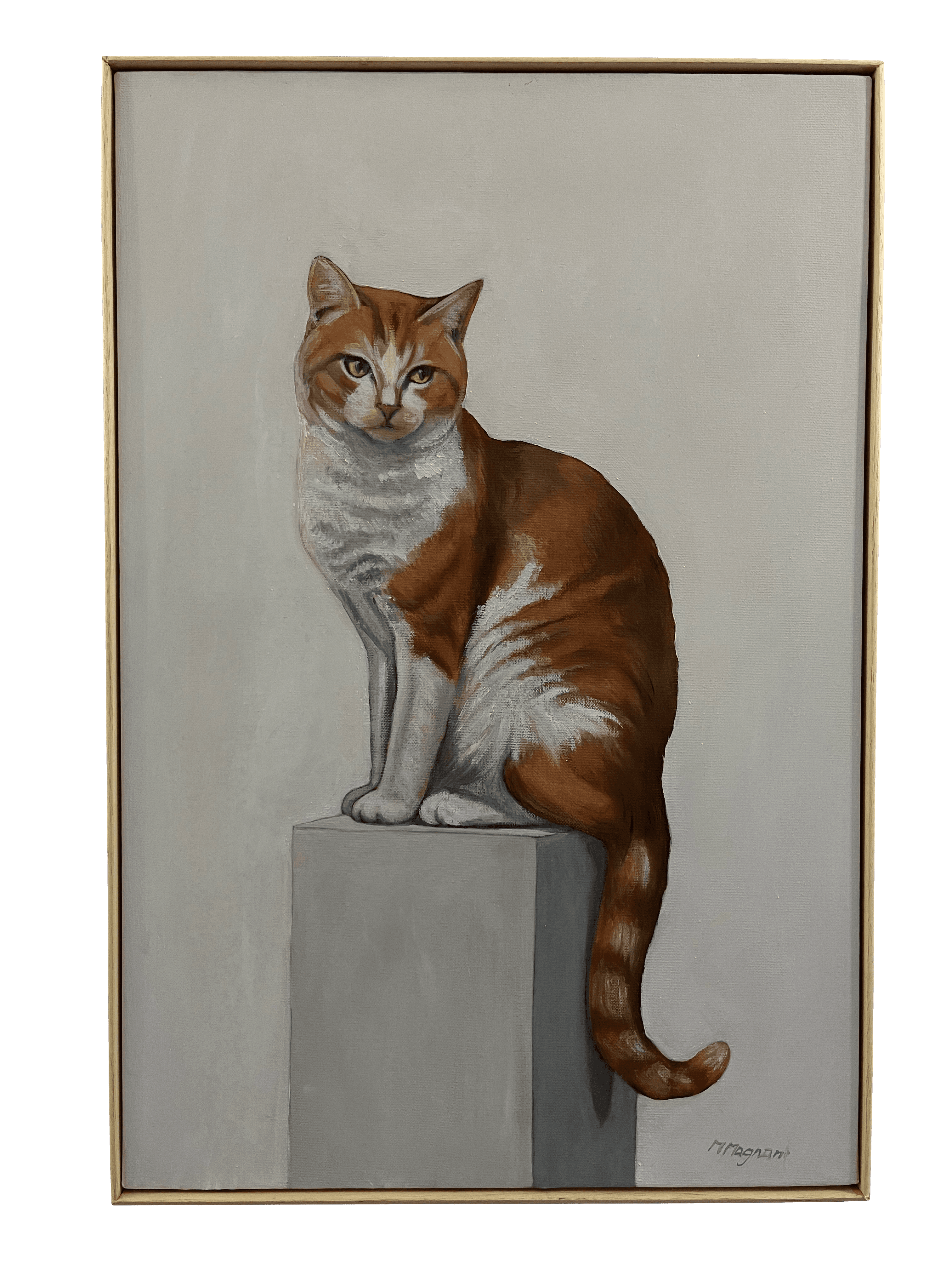 In quest'opera, Marco Magnani ritrae un gatto bicolor (bianco e rosso) in una posa di regale attesa. Il mantello, reso con pennellate cariche di luce, contrasta elegantemente con la geometria solida del basamento grigio. Il formato verticale e la cornice artigianale floating in legno naturale conferiscono al dipinto una profondità moderna, trasformando il soggetto in un'icona di calma e nobiltà. Perfetto come pezzo unico o in coppia speculare.