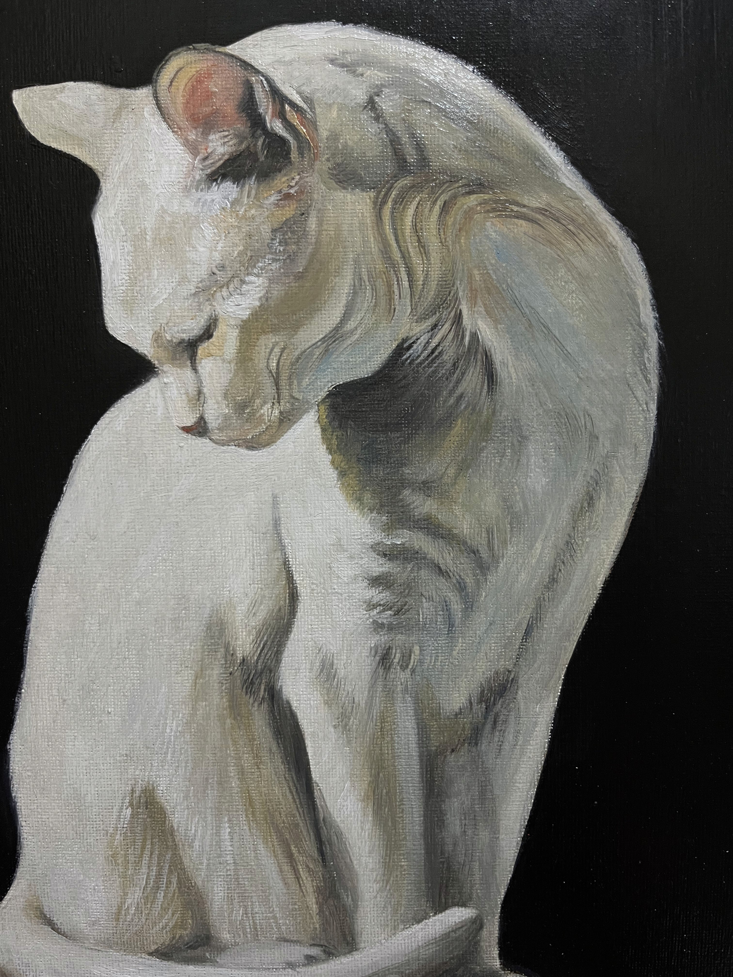 Un profilo luminoso emerge dal buio: una presenza silenziosa, sospesa, che abita la soglia tra luce e ombra. In quest'opera, il candore del manto diventa protagonista assoluto, emergendo dal fondo scuro con un'eleganza quasi eterea. La postura riflessiva del gatto invita l'osservatore a un istante di calma meditativa, dove ogni pennellata celebra la grazia silenziosa della natura felina.